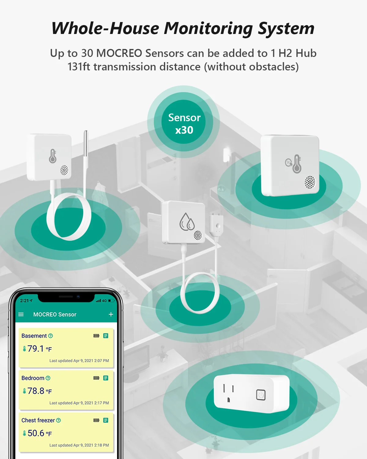 - MOCREO H2 Hub Compatibility – BLE Sensor: ST5, ST6, ST9, ST10, SW2; Whole-house smart monitoring can be easily realized by adding different types of MOCREO Sensors